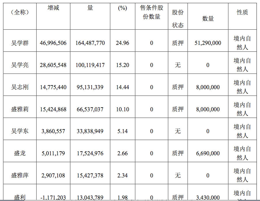 截至2019年年底,吴学群持有股份数1.65亿股,持股比例24.96%,质押5129万股,质押比例31.18%;吴志刚持有公司股份数9513.1万股,质押800万股,质押比例8.41%;盛雅莉持有公司股份6653.7万股,质押800万股,质押比例12.02%。