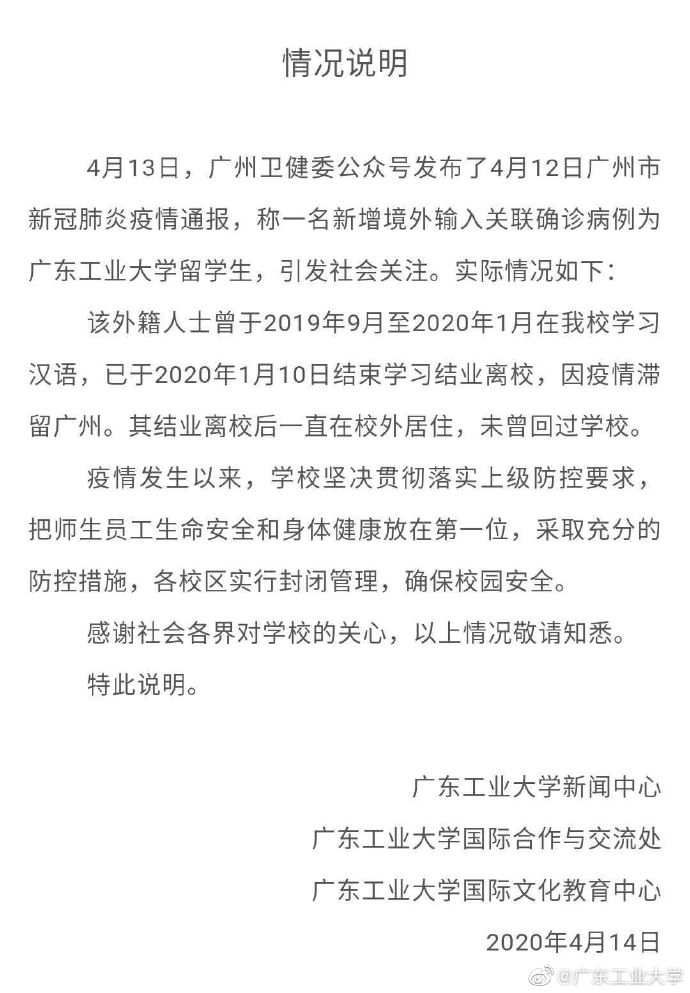 据广东工业大学官方微博消息,4月13日,广州卫健委公众号发布了4月12日广州市新冠肺炎疫情通报,称一名新增境外输入关联确诊病例为广东工业大学留学生,引发社会关注。实际情况如下: