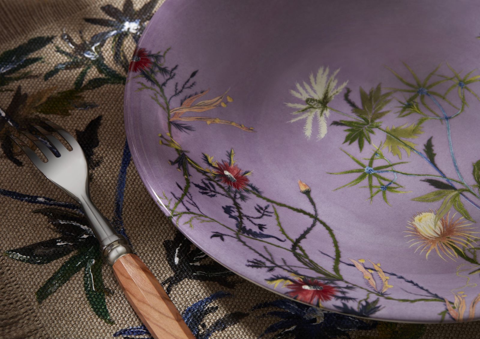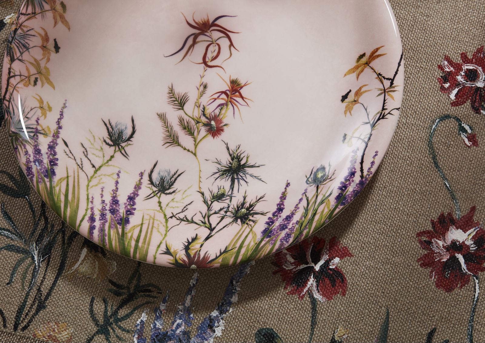 DIOR GARDENS的创作思路则来自品牌女装创意总监Maria Grazia Chiuri设计的2020春夏系列,运用大量来自自然草木的色彩和图案来装点质地细腻的瓷器,并从拉菲草裙的轮廓和材质中汲取灵感,展现一副清新而悠闲的田园野餐图景。