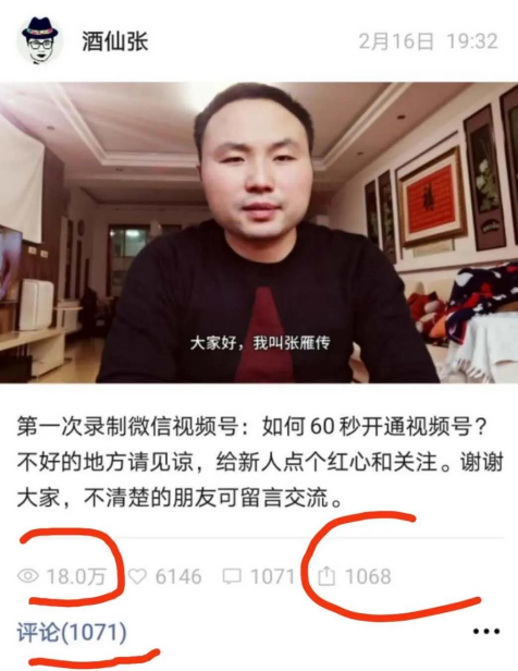 第一个作品就“爆”了,是酒仙张没有想到的。2月16日,他发布了第一个视频,内容以如何开通视频号为主题。他隐约感觉到,在红利期最吸引人的内容是,如何开通视频号以及相关教学。