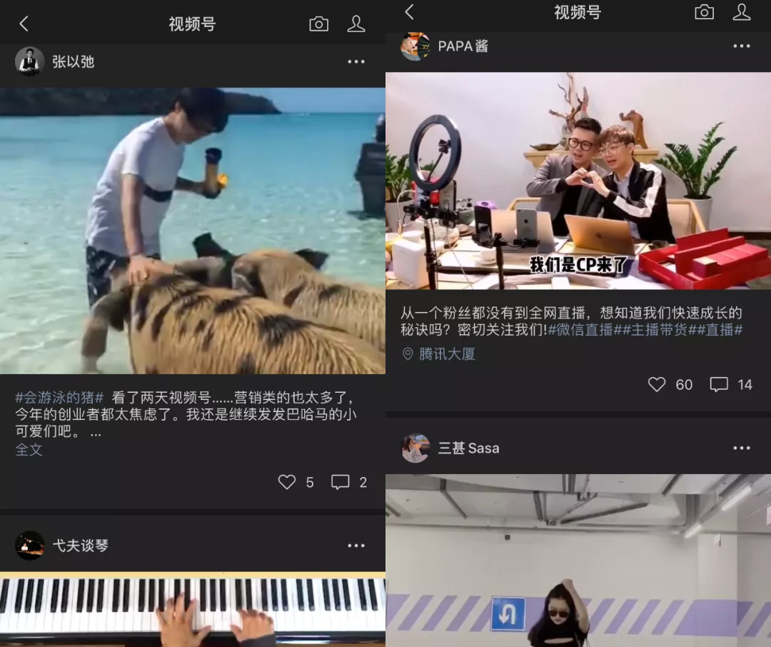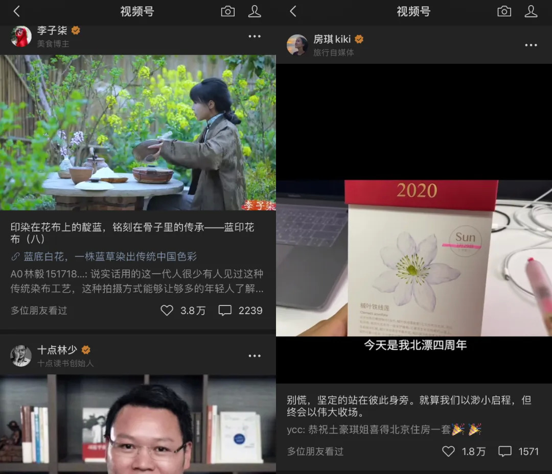 视频号也吸引了快手、抖音以外的人群,包括经纬中国创始管理合伙人张颖、金沙江创业投资基金董事总经理朱啸虎、分众传媒创始人江南春、作家冯唐,这些从来没有入驻过短视频平台的企业家和作家,却活跃在视频号上。