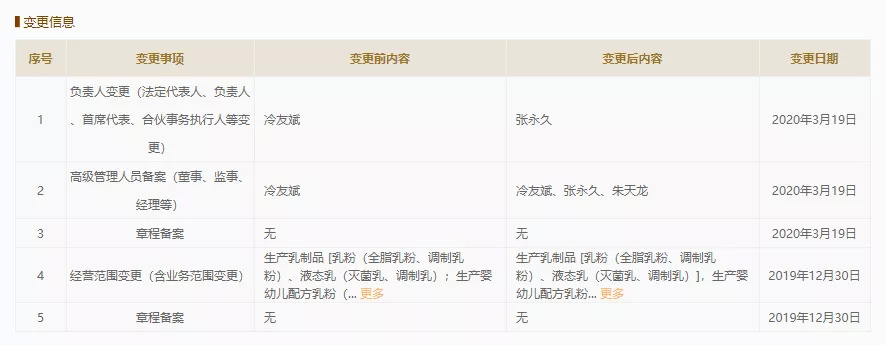 工商资料显示,2020年3月19日,黑龙江飞鹤发生了负责人变更(法定代表人、负责人、首席代表、合伙事务执行人等),由冷友斌变更为张永久。