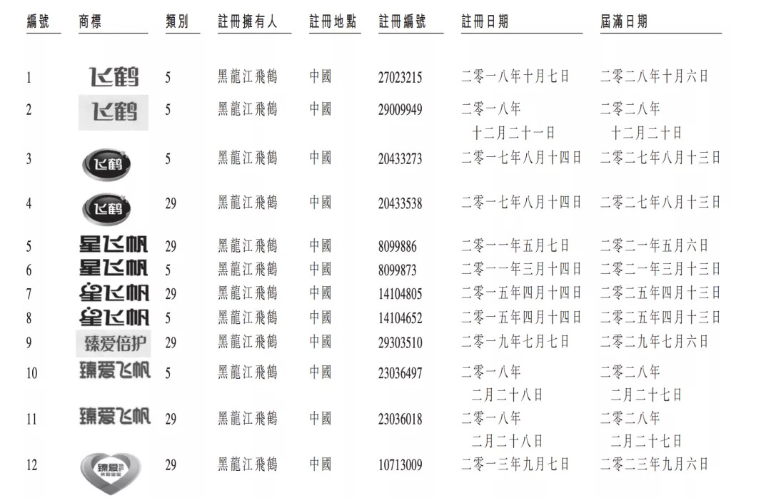 同时,上市文件也显示,黑龙江飞鹤是飞鹤集团众多重大知识产权的注册持有人,从“飞鹤”商标、“星飞帆”商标、奶粉罐专利到飞鹤官网的域名,等等。