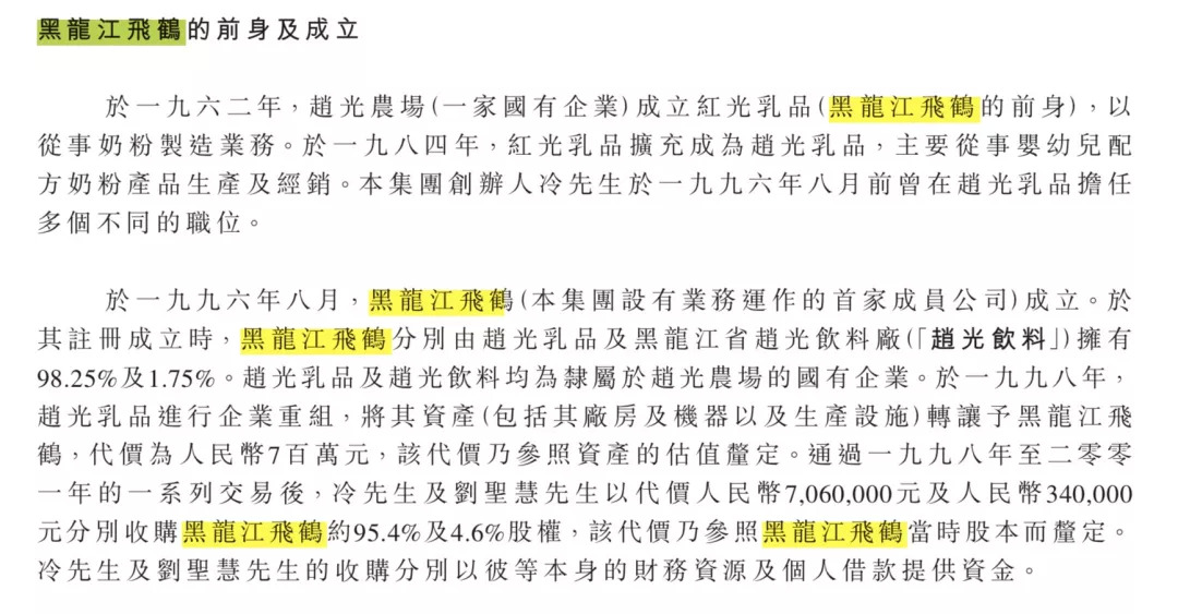 小食代翻看飞鹤上市文件发现,黑龙江飞鹤成立于1996年8月,注册资本为4500万美元,主要业务为生产及经销婴幼儿配方奶粉产品。据了解,黑龙江飞鹤是飞鹤的全资附属公司,也是飞鹤“集团设有业务运作的首家成员公司”。