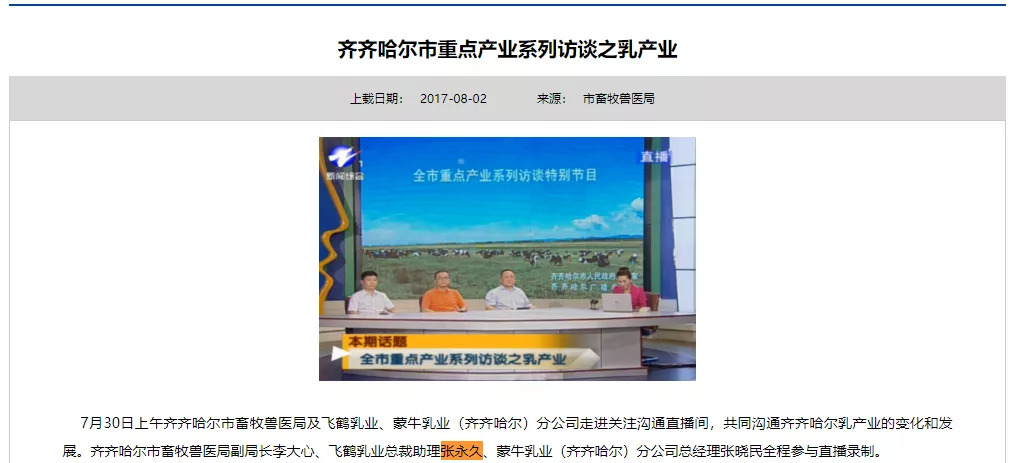 小食代翻查公开资料还发现,在与飞鹤相关的新闻中,张永久的名字也不时出现在媒体的报道中。例如在2017年,媒体指“飞鹤乳业总裁助理张永久代表公司参加了乳制品质量安全及保障技术的专题讨论”。同一年,张永久还曾参与一档齐齐哈尔乳业访谈的节目,身份也是飞鹤乳业总裁助理。