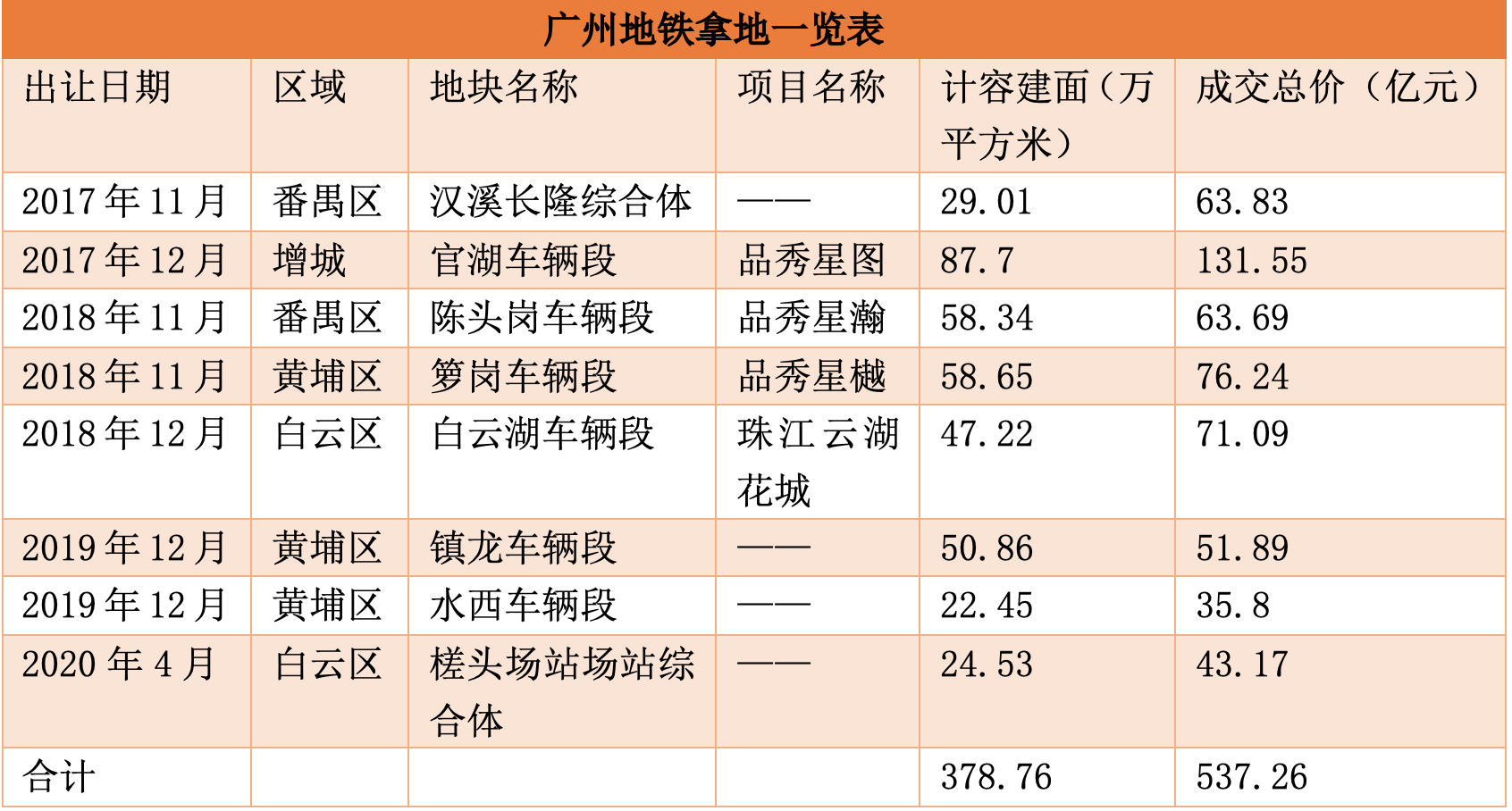 2017年以来,广州已成功出让8宗TOD项目地块,每一宗都由广州地铁集团拿下,包括建筑面积达87.7万平方米的官湖车辆段地块、建筑面积达58.65万平方米的萝岗车辆段地块等,合计总建面约378.76万平方米,拿地总金额超537亿元。
