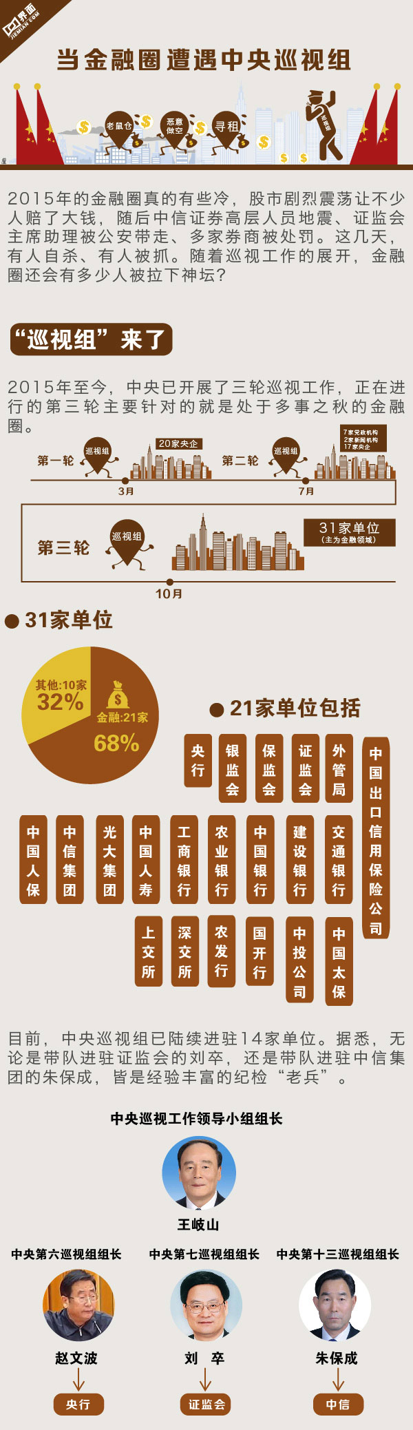 2015年的金融圈真的有些冷,股市剧烈震荡让不少人赔了大钱,随后中信证券高层人员地震、证监会主席助理被公安带走、多家券商被处罚。这几天,有人自杀、有人被抓。随着巡视工作的展开,金融圈还会有多少人被拉下神坛?