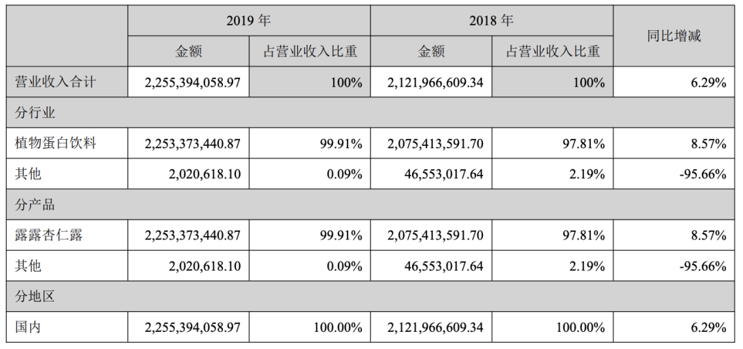 作为一家老牌饮品企业,承德露露上市20余年,主营业务基本没有变过,就是生产植物蛋白饮料露露杏仁露。根据财报,杏仁露业务在承德露露的整体营收占比高达99.91%——也就是说,承德露露除了露露杏仁露这一个产品之外,基本上就没有任何其他产品或业务营收来源。