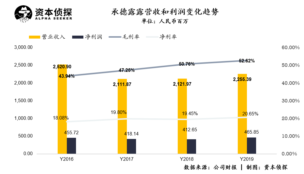 年报显示,2015年至2017年,承德露露的营收分别为27.06亿、25.21亿、21.12亿;净利润分别为4.63亿、4.5亿、4.14亿。也是一直到了2018年和2019年才略有回升,但仍然不及2015年的表现。