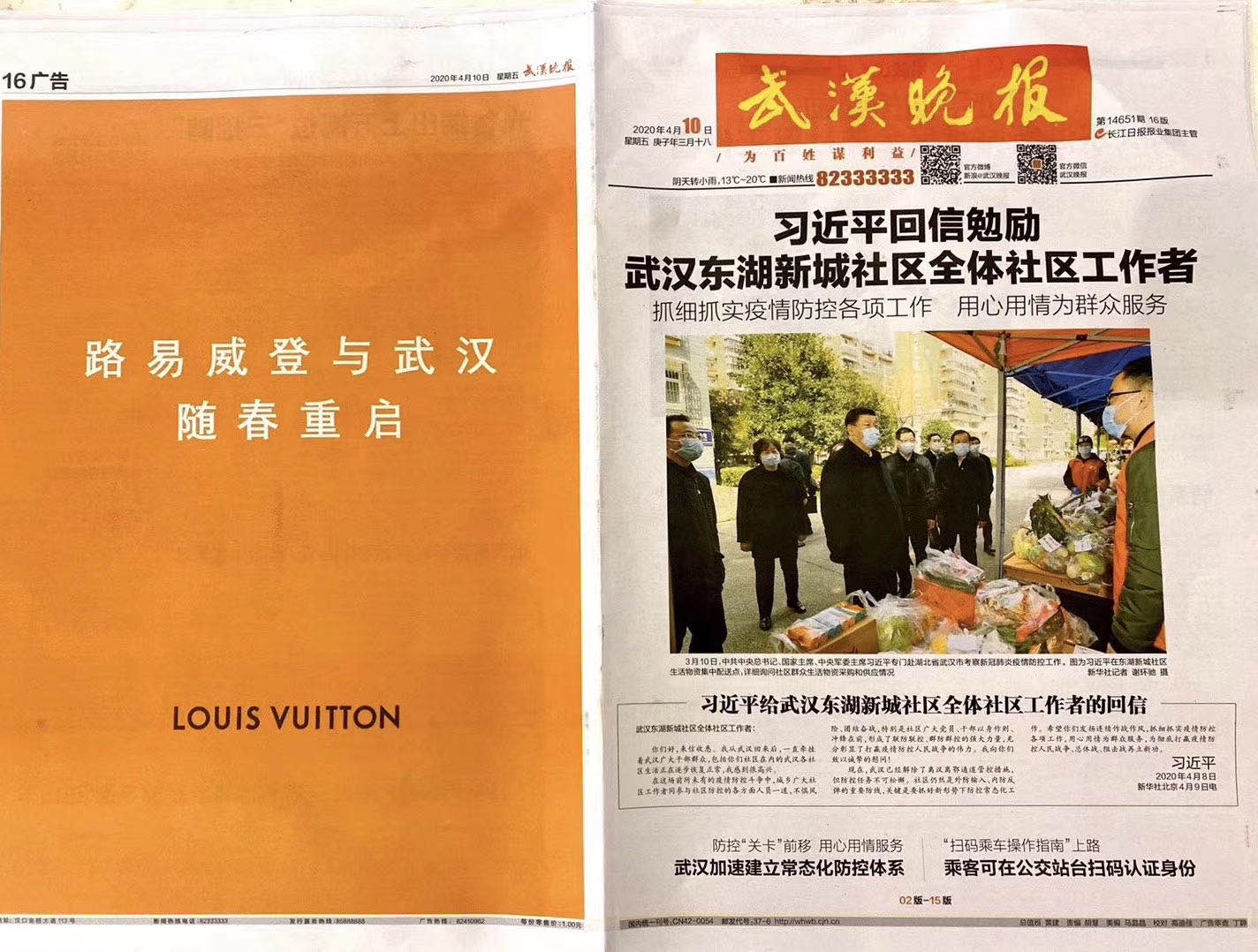 而在疫情中心的武汉,奢侈品消费也在逐渐恢复。3月30日,武汉的多家购物中心正式重新开门迎客,其中位于武汉国际购物中心的Prada、Burberry门店也再度开店。在4月10号,Louis Vuitton更是买下《武汉晚报》整版广告位,来宣告品牌位于武汉的全部门店正式复工。