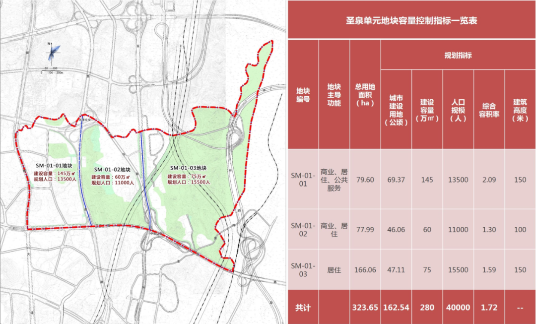 圣泉单元(SM-01)规划范围北至大洼接观山湖区,南抵北京西路,东西两侧分别以黔灵山脉和同城大道为界;规划总用地面积323.65公顷,其中,城市建设用地162.54公顷;建设容量控制在280万平米,综合容积率1.72,规划人口4万人。