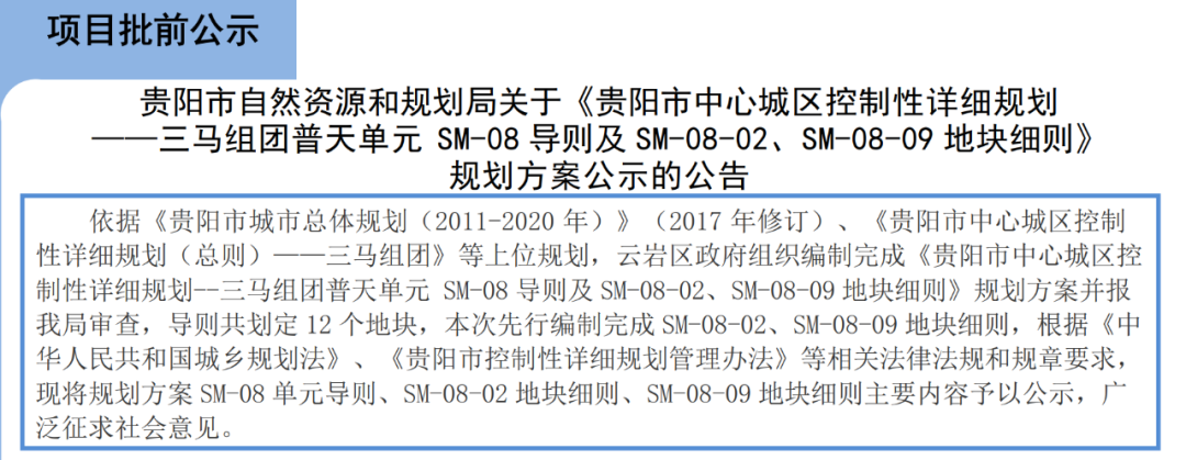 普天单元(SM-08)规划范围北接观山湖区,南至普杨路、思亲园公墓一带,东以小湾河为界,西接金阳大道延伸段;规划总用地面积417.48公顷,其中,城市建设用地311.45公顷;建设容量控制在560万平米,综合容积率1.8,规划人口8.2万人。