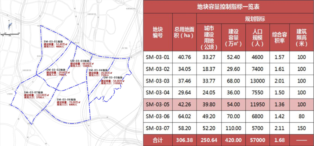 SM-03-05总用地面积42.26公顷,其中,城市建设用地39.8公顷、非建设用地2.46公顷;总建筑量54万平米,居住人口1.195万人,综合容积率1.36。