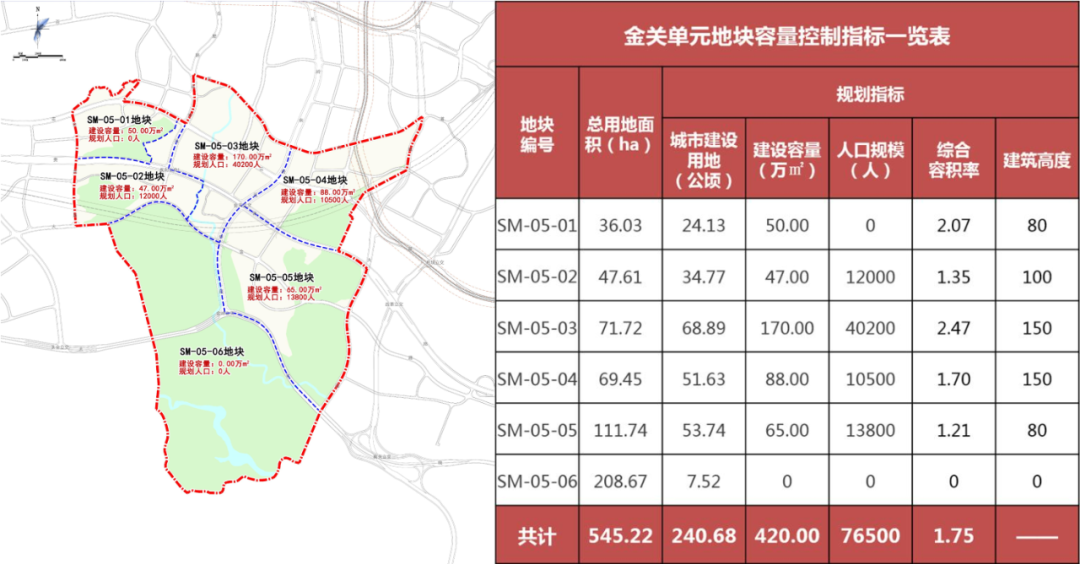 金关单元(SM-05)规划范围北侧至百花大道、思亲园公墓一带,南至三马组团边界,西至金燕路,东至同城大道;规划总用地面积545.22公顷,其中,城市建设用地240.68公顷;建设容量控制在420万平米,综合容积率1.75,规划人口7.65万人。
