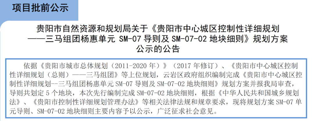 杨惠单元(SM-07)规划范围东至金阳大道延伸段、云潭南路,南抵百花山脉,西北两侧以观山湖区为界;规划总用地面积416.13公顷,其中,城市建设用地224.8公顷;建设容量控制在310万平米,综合容积率1.38,规划人口6万人。