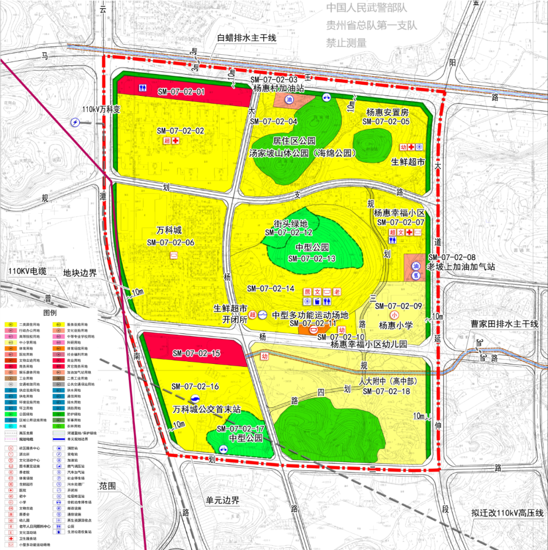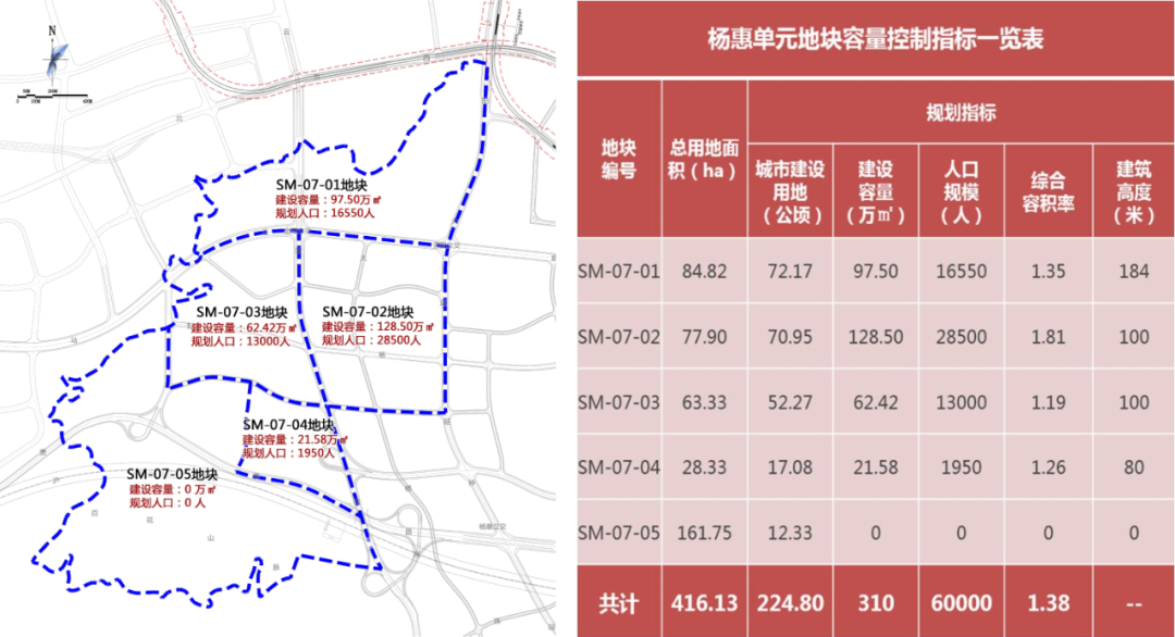 杨惠单元SM-07-02地块南至规划二路,西至云潭南路,东至金阳大道延伸段,北至马王路,总用地面积77.9公顷,其中,城市建设用地70.95公顷;总建筑量128.5万平米,居住人口2.85万人,综合容积率1.81。