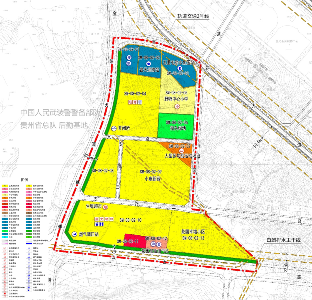 其中,规划编制的细则地块有2个:SM-08-02地块,北至百花大道,南抵马王路,西侧以金阳大道延伸段为界,东邻茶园路;SM-08-09地块,北至马王路,南抵思亲园公墓,西侧以百花大道为界,东邻规划支路。