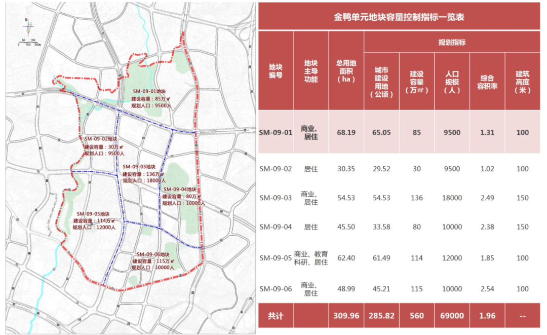 SM-09-01总用地面积68.19公顷,其中,城市建设用地65.05公顷;总建筑量85万平米,居住人口0.95万人,综合容积率1.31。