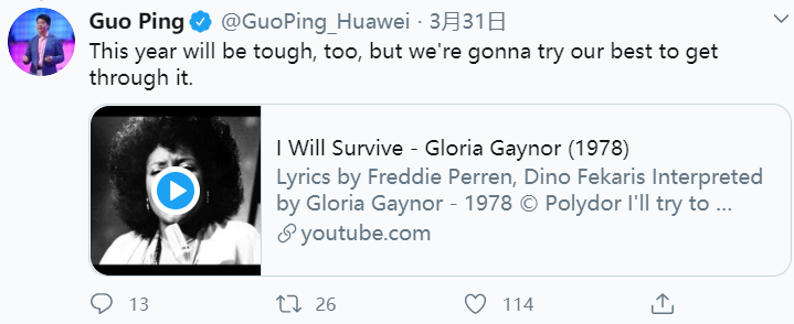 3月31日,华为轮值董事长郭平在刚刚开通的推特上表示:“今年又是困难的一年,但我们会尽最大努力过这一关。”