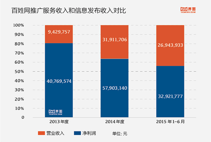 再来看下业务模式和行业竞争力。提到行业竞争,就绕不过58以及赶集两大,更绕不过这两家公司在合并后对于百姓网带来的冲击。根据公开转让书,百姓网似乎在3-6线城市的细分领域来得更有优势。根据艾瑞咨询《中国3-6线城市分类信息网站数据挖掘报告》显示,2014年6月-2015年6月,3-6线城市三家分类信息网站的用户规模都保持增长态势。其中58同城和赶集网月均增速分别为1.6%和1.1%,用户规模基本已处于稳定增长期;百姓网用户规模月均增速高达5.9%,呈现强劲的增长态势。移动端App方面,百姓网的覆盖比例达到45.1%,接近一半;其次才是58同城和赶集生活。这组数据说明的信息翻译过来,就是百姓网正在以极快的增长率在抢占市场份额,而且App移动端的用户粘性极为明显。这与以信息质量让百姓主产生粘性,而非大举投入广告的百姓网逻辑相吻合。此外,百姓网的烧钱比例也似乎比同行业来的低。根据公开招股书披露的2015年销售费用占比显示,百姓网销售费用占收入的占比为99%,乍一看很高,但是行业平均比例却超过了100%,多数公司更多的是在亏本赚吆喝。在投入比行业平均水平地但是用户粘性以及覆盖率在增长的情况下,显然投入产出比来得更高。