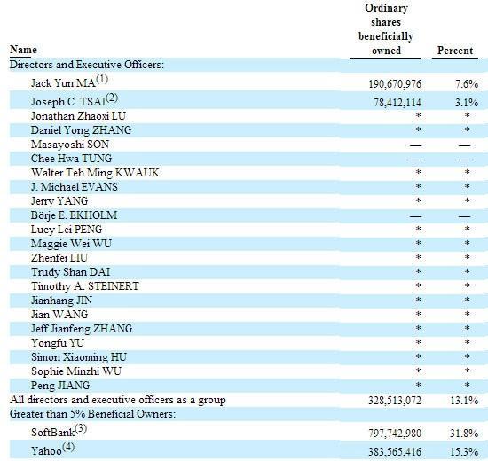 阿里巴巴集团管理层一共持有328,513,072股,持股比例为13.1%;大股东软银持有797,742,980股,持股比例为31.8%;雅虎持有383,565,416股,持股比例为15.3%。