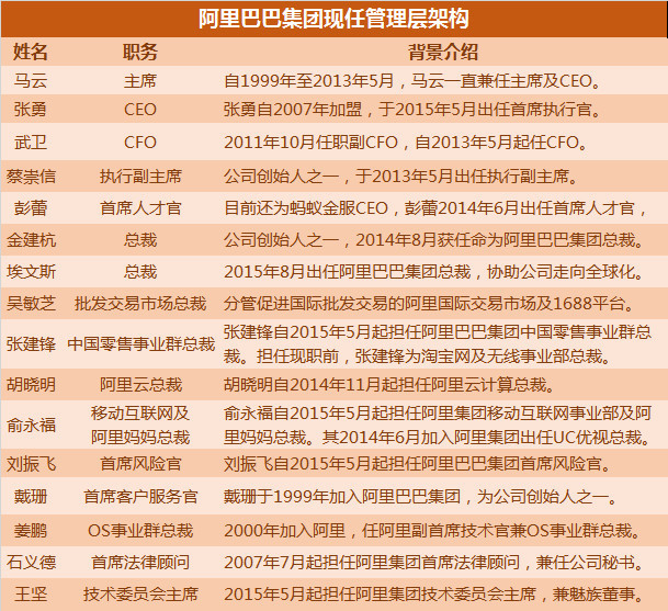 马云说,阿里集团不仅有张勇这样的杰出领军人 物,更有站在他背后的一批70后猛将,B2B的吴敏芝,淘系的张建锋(行癫),阿里云的胡晓明(孙权),菜鸟的童文红,移动互联网的俞永福,还有身经百战坐镇中场的老将姜鹏(三丰)、戴珊(苏荃)、吴泳铭(东邪)、蒋芳。