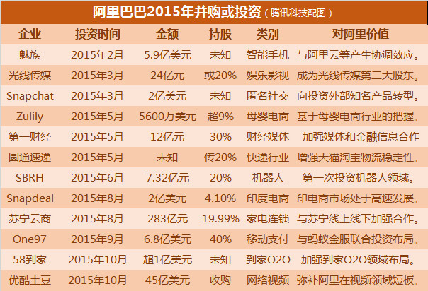 据腾讯科技统计,2015年中国科技行业发生的7大投资并购中,与阿里巴巴集团直接和间接相关的有5起,包括阿里5.9亿美元投资魅族、283亿元投资苏宁云商、拟45亿美元收购优酷土豆。