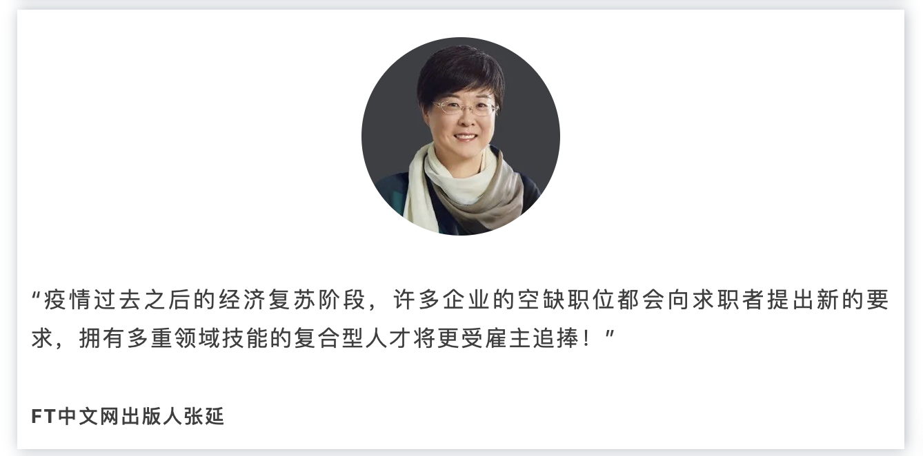 对于企业管理者来说也一样,我们也需要重新考虑招聘的思路。疫情过去之后的经济复苏阶段,许多企业的空缺职位都会向求职者提出新的要求,拥有多重领域技能的复合型人才将更受雇主追捧。