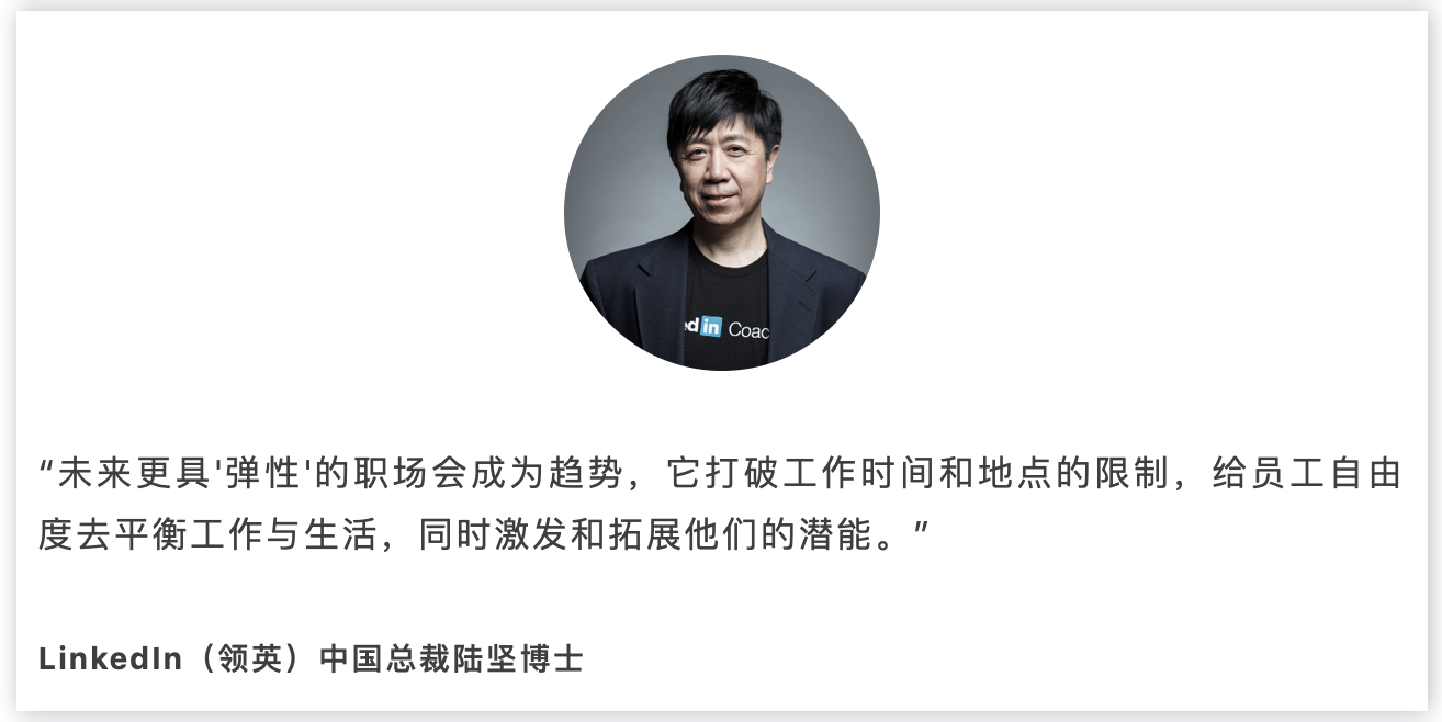 领英中国总裁陆坚:过去几个月里,说到职场,最热门的关键词就是“远程办公”了。领英的一份中国会员调研显示,疫情期间超过六成中国职场人有远程办公的经历,特别是互联网、金融、电子商务、教育行业普及程度更高。据领英全球数据所示,领英平台关于“远程办公”的搜索次数在过去两个月间增长了260%。疫情期间,出于对员工健康的考虑,包括领英在内的很多公司均要求员工远程办公,这已成为疫情下复工的必要手段。