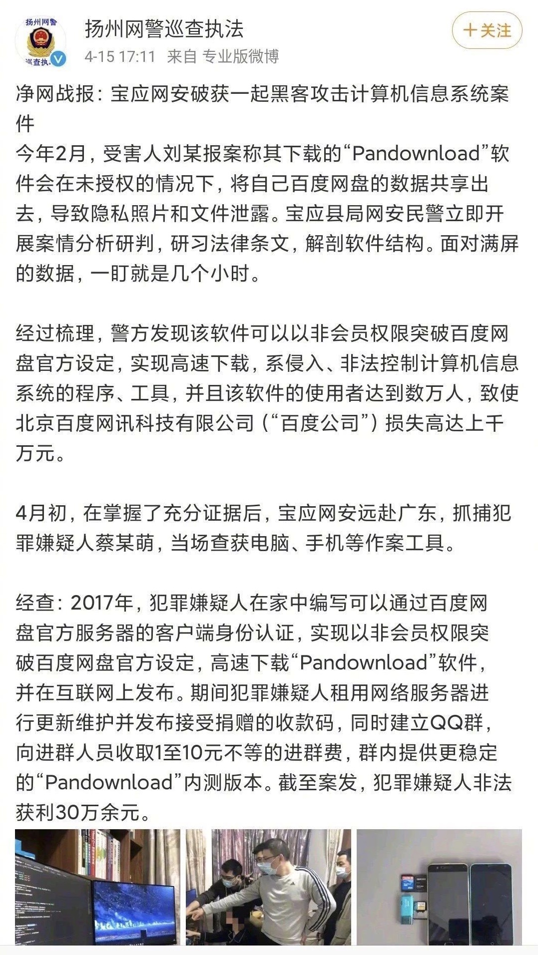 宝应警方了解到该软件可以以非会员权限实现百度网盘资源的高速下载,致使百度公司损失高达上千万元。4月初,警方于广东抓捕犯罪嫌疑人蔡某萌,并没收其作案工具。经查,该软件开发者共非法获利30万余元。