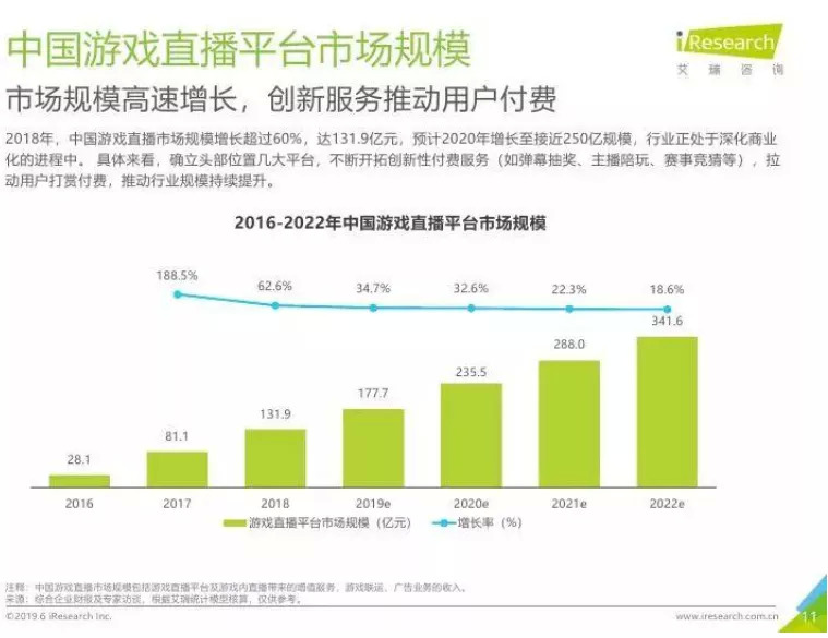 在艾瑞咨询、前瞻产业研究院的报告中,都肯定了游戏直播市场规模的增长迅速。2018年中国游戏直播市场规模为131.9亿元,增长超过60%,艾瑞咨询预计2020年中国游戏直播市场规模将达到235亿元,其中电子竞技游戏直播市场是重要组成部分。