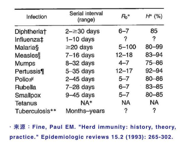 群体免疫的实现,同样需要全社会的密切配合。以麻疹(measles)为例。一篇被广泛引用的讨论群体免疫的论文给出了几种重要传染病的R0和群体免疫(H)估计。麻疹传染性强,R0值很大,至少需要人群中90%以上的注射疫苗才能够达到群体免疫。