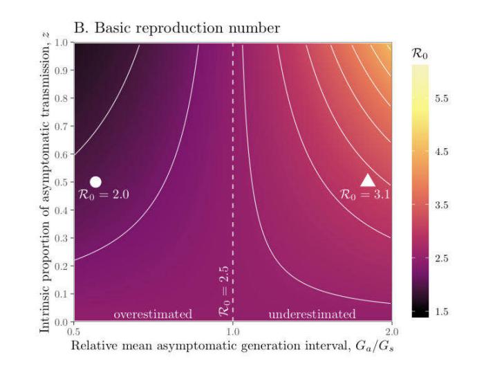 研究人员用世代间隔(一个个体被感染到这个个体感染给他人的时间)来表述不同群体的传播速度,通过建模方法,发现如果无症状传播的世代间隔长于有症状传播的世代间隔,那么R0就会被低估。如果轻症患者没有被确诊和记录,也能以同样的方式影响传播模式,对R0的预测则会产生更大的系统误差。