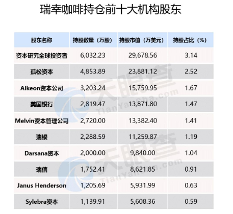 截止去年底,瑞幸咖啡持仓最大的前十大机构股东是资本研究全球投资者(Capital Research Global Investors),持有6032万股。