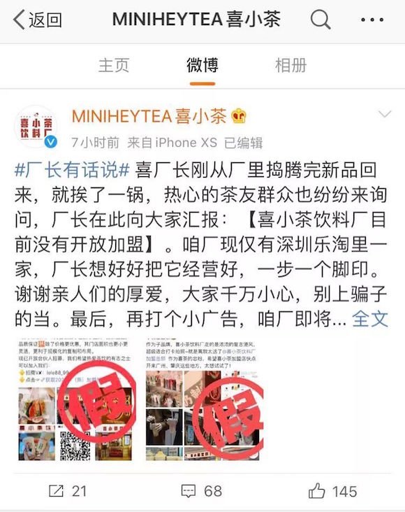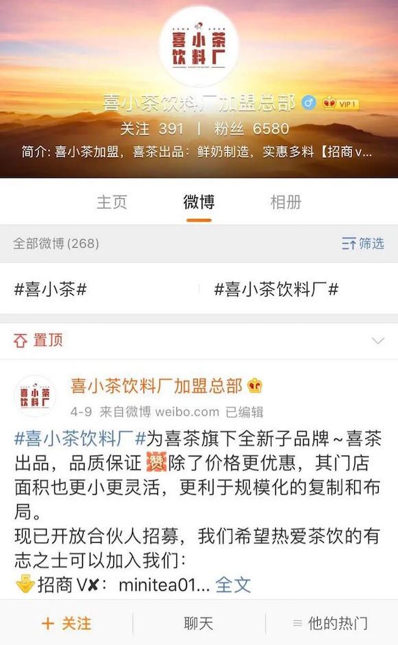 我又搜到微博认证是深圳美西西餐饮管理有限公司华强北广场分店的喜小茶官方账号,在其发布的仅有7条微博内容里,专门有一条声明:喜小茶饮料厂目前没有开放加盟,还贴出一张图片表示“加盟账号为假”。