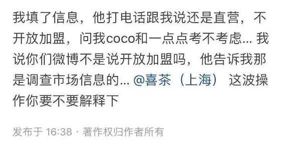 在知乎上,已经有网友表示:提交了报名信息,却被打电话告知还是直营,不开放加盟,CoCo和1点点考不考虑。