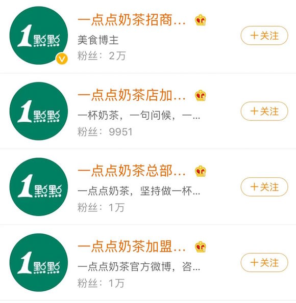 在微博搜索1点点、CoCo都可等,也能发现不少虚假加盟账号。甚至在2019年,已经有一些城市大批量开出虚假CoCo山寨外卖店。
