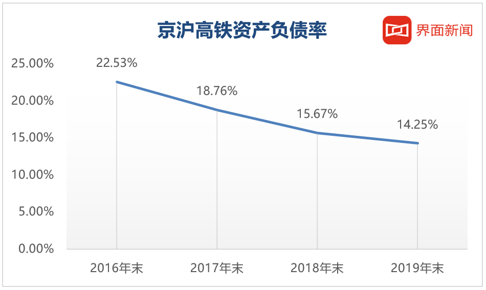 京沪高铁资产负债率一直在下降。截止2019年末,京沪高铁资产总计1851.51亿元,负债总计263.77亿元,资产负债率14.25%,为近几年最低值。