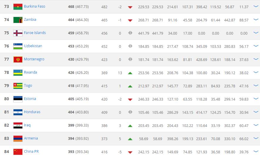 (在FIFA的排名页面上翻找布基纳法索时,正好可以看见排在第84位的中国,此时此刻,小唯内心五味杂陈)