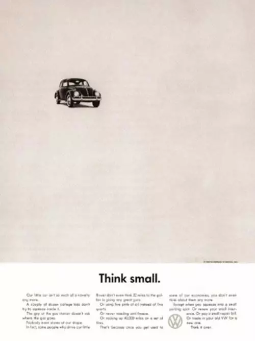 你可能还记得甲壳虫经典的“Thinke Small”广告,它身形虽小,但突出了自己耗油低,不需防冻剂,低维修费用,易停车等特点,借此开拓了小型汽车市场。