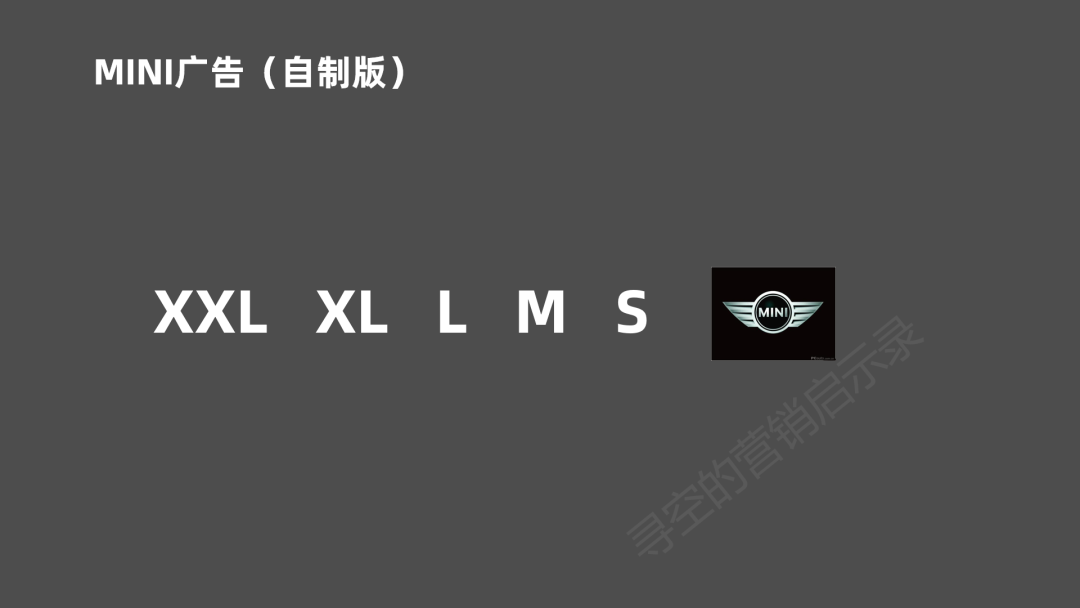 另一个小型汽车MINI 同样采取了这种策略,其在SUV大行其道的年代推出了这样的广告:XXL XL L M S MINI 。这则广告让人印象深刻,它没有与大型车PK,而是逆向思考,突出自己小的特点。