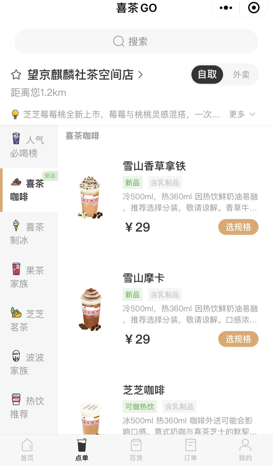 最近喜茶低调推出了咖啡单品,在其小程序上可以清晰看到分类,这意味着喜茶跳出了它固有的奶茶品类,进军了一个全新的品类市场,成为星巴克、瑞幸等的竞争对手。