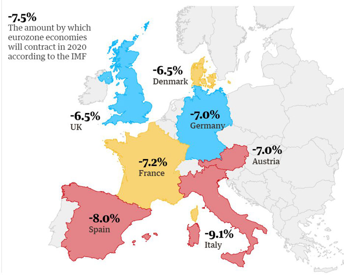 国际货币基金组织(IMF)最新预测显示,今年欧元区经济将萎缩7.5%。意大利和西班牙依然是重灾区,分别萎缩9.1%和8.0%。