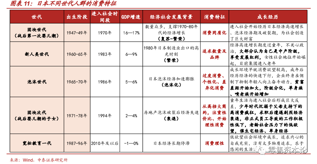 为探析日本1999-00年代消费趋势变化背后的“世代人群”的消费特征驱动,首先我们要明确:日本不同世代及其消费特征的划分和特点。
