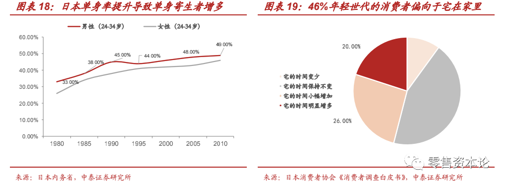 3)“宅经济”及便捷化消费“异军突起”。伴随日本“年轻世代”欲望降低与单身人群的扩大,“宅经济”及其所代表的便捷化消费迅速扩大。