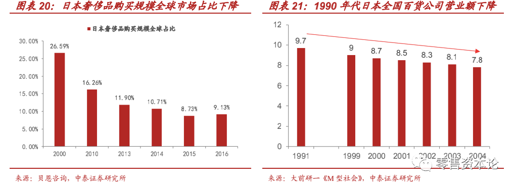 1)2000年开始,日本奢侈品消费市场全球占比日渐萎缩:经济泡沫破裂后的“一亿中产崩塌”,或预示着日本整体社会的消费升级时代的结束。