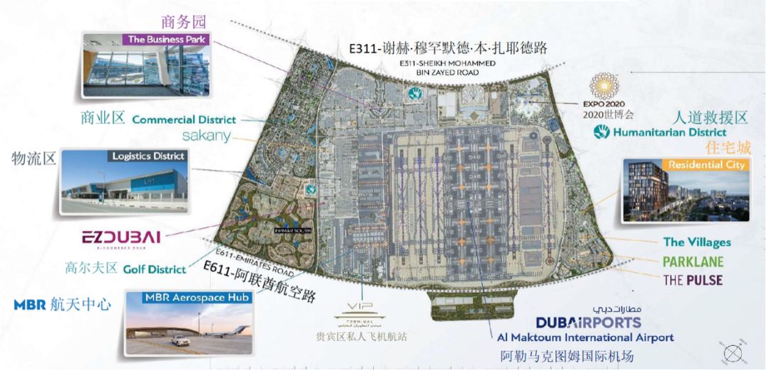 得力于迪拜的地理位置优势,8个飞行小时内连接全球近三分之二的人口,迪拜南城也将以”通航”、”航空物流”和”航空维修”为核心,成为中东航空产业枢纽。官方估计届时迪拜南城总体产业将会贡献整个迪拜35% GDP。