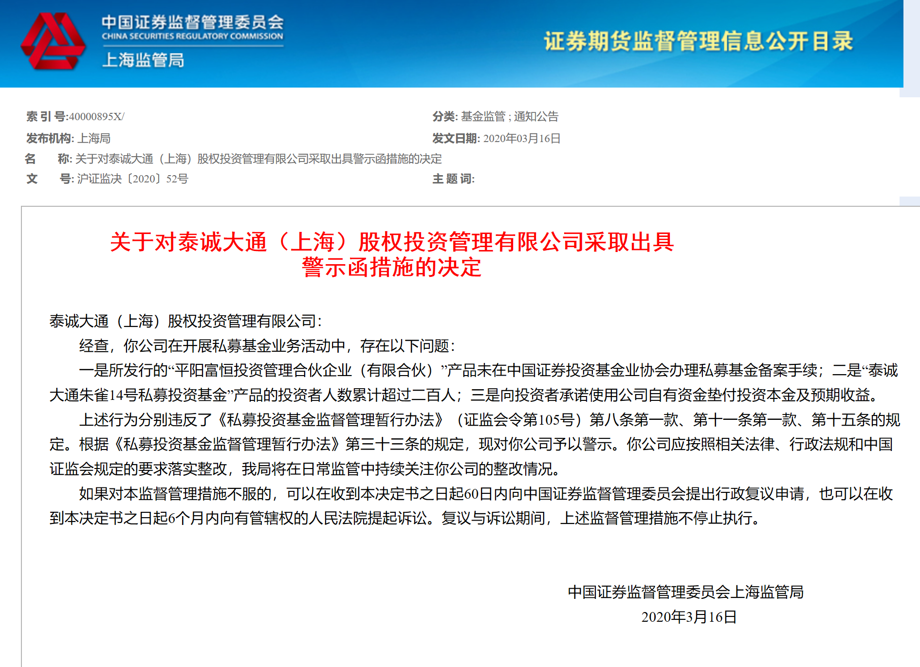 上海证监局认为,上述行为分别违反了《私募投资基金监督管理暂行办法》(证监会令第105号)第八条第一款、第十一条第一款、第十五条的规定。根据《私募投资基金监督管理暂行办法》第三十三条的规定,故对泰诚大通予以警示。