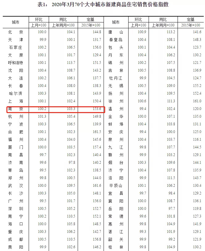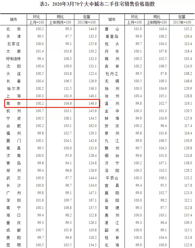 今日(4月16日),国家统计局发布了2020年3月70个大中城市新建商品住宅销售价格数据,其中,南京新房环比上涨0.2%,同比上涨3.3%;二手房方面,3月房价环比上涨0.2%,同比上涨4.6%。