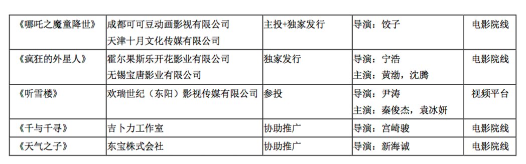 2019年全年,光线传媒参与投资、发行或协助推广并计入本报告期票房影片共十八部,总票房为138.67亿元,其中《哪吒之魔童降世》成为去年的爆款电影,打破中国上映的动画电影首日/单日票房最高记录,中国市场最高观影人次等多项票房纪录。